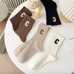 2024 Otoño Invierno calcetines deportivos para mujer, algodón peinado sólido, bordado, letra grande C, estilo universitario, parte inferior Ins, puño de punto